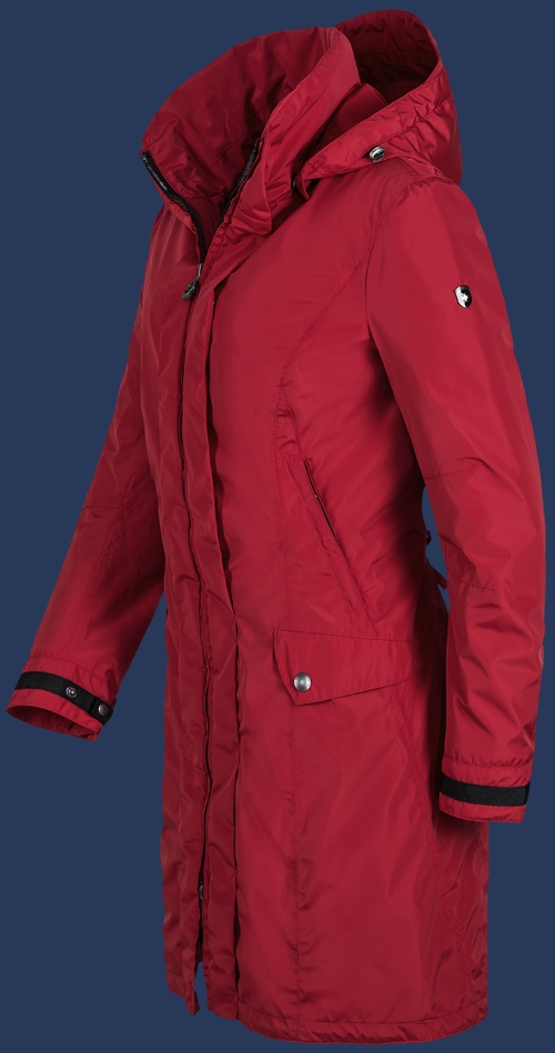 Длинная, приталенная куртка с длиной сзади около 93см в размере М. Два диагональных кармана оснащены молниями, два дополнительных карманами с кнопками. В подкладке из вискозы еще два кармана на молнии. Широкие передние планки, переходящие в закругленный воротник, подчеркивают узкий силуэт куртки. Узкая лента для регулировки талии может быть завязана за спиной. Ширина манжет регулируемая и украшена тесьмой, так же как и швы в поясе на спине. Подол можно собрать шнурком. Съемный, регулируемый капюшон дополняет возможности этой модели. Голд-Кост легко чистить и можно стирать в машине при 30°С. Не рекомендуется применять химическую чистку.