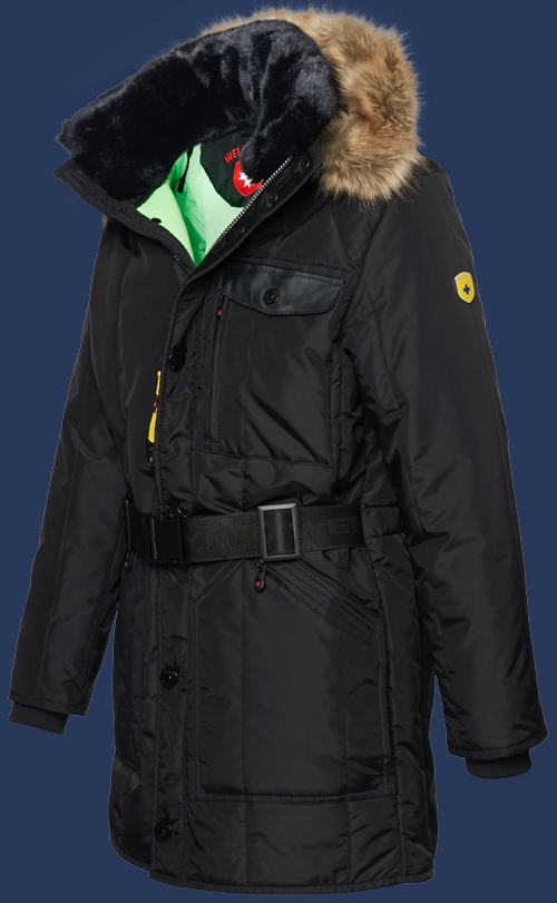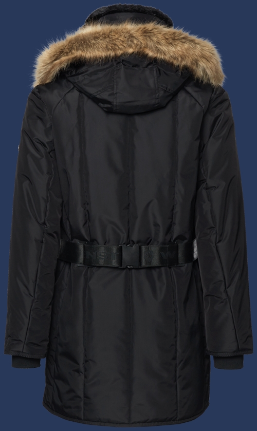 Стеганое пальто средней длины. Пояс из широкой и прочной ленты с пряжкой крепится в боковом шве, его можно носить по фигуре спереди или свободно сзади. В задней части ширину талии регулирует резинка. Большие накладные карманы, закрываются на молнии, а также имеют удобные боковые разрезы для рук. Нагрудный карман с клапаном из кожи притягивает взгляд. Внутренний воротник из искусственного меха является съемным, также как и контрастный мех по краям капюшона. Сам капюшон съемный, его можно отстегнуть с помощью застежки-молнии, он регулируется в двух направлениях. В рукавах теплые трикотажные манжеты. Icehouse легко стирать в стиральной машине при температуре 30°C, однако, не следует применять смягчители ткани или химчистку.