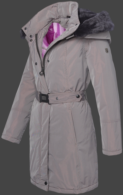 Скроенная по фигуре, короткая куртка с длиной спины около 90 см в размере М. В целях предотвращения попадания дождя и снега все швы проклеены. Двусторонняя молния, пояс с пряжкой и боковые закрывающиеся карманы являются более практичными деталями. В мягкой подкладке из полиэстера есть два внутренних кармана. Ярким акцентом в этой модели является огромный капюшон отделанный мягким тканым мехом, который можно носить как шаль на плечах. Перед стиркой капюшон можно снять. Это элегантная модель прекрасно оборудована для зимы. Ее легко чистить. Рекомендуется машинная стирка при температуре 30°С. Не рекомендуется применять смягчители ткани и химическую чистку.
