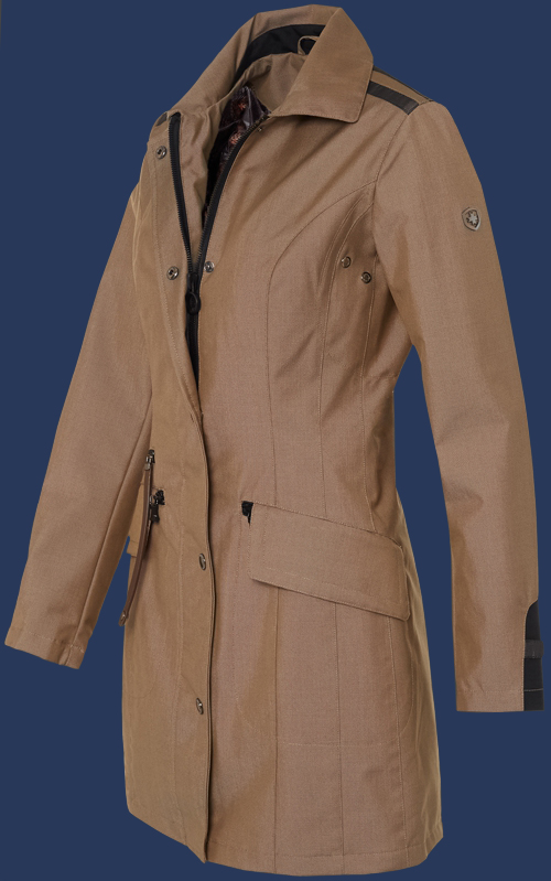 Классическое, приталенное, средней длины пальто с двумя полосами из контрастной ткани по плечу и вставки в воротнике. Карманные молнии закрыты клапанами, на правой стороне пальто имеет дополнительно металлическую молнию с длинным кожаным ремешком, который можно прикрепить на кнопки. Рукава также украшены контрастной тканью. Благодаря мембране на ткани внутри является ветро- и водонепроницаемым, швы проклеены. Monegasque легко чистить и можно стирать в машине при 30°С. Не рекомендуется применять химическую чистку и смягчители ткани.