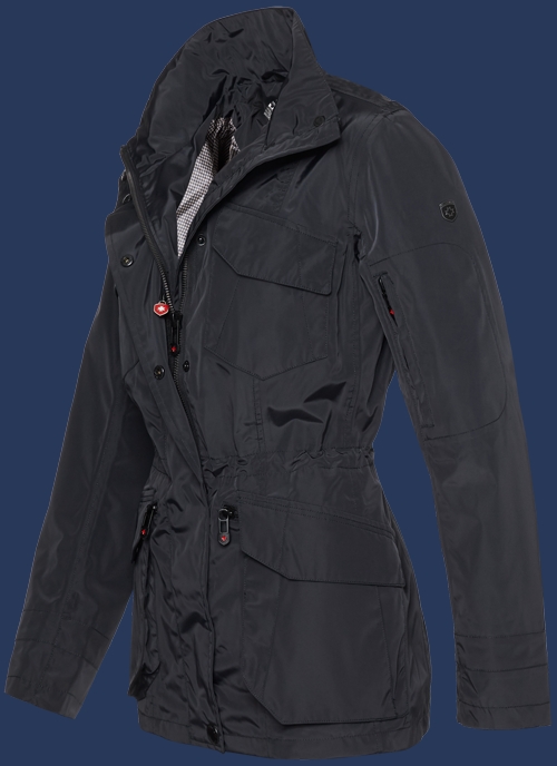 Свободная курка в стиле 4-Pocket-Style (стиль четырех карманов) с асимметричными карманами и плоскими пришитыми карманами на груди. В нижней части объемные карманы с удобными боковыми отверстиями для рук, которые могут закрываться молниями. Вокруг воротника есть контрастная тесьма. Талия регулируется изнутри стоппером. На левом рукаве есть дополнительный карман на молнии. Благодаря ламинированию на ткани внутри, куртка Мондриана водонепроницаемая и ветрозащитная, но дышащая, швы проклеены. Ее легко чистить и можно стирать в машине при 30°С. Не рекомендуется применять химическую чистку и смягчители ткани.
