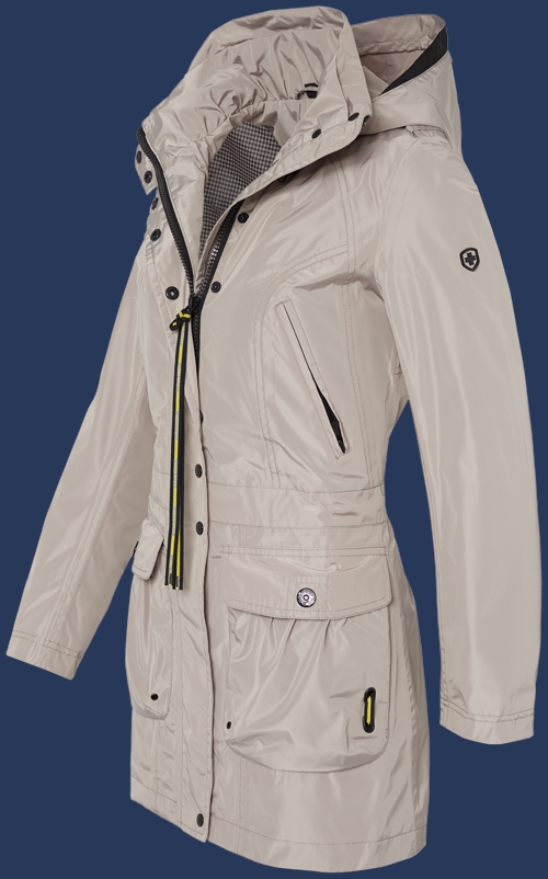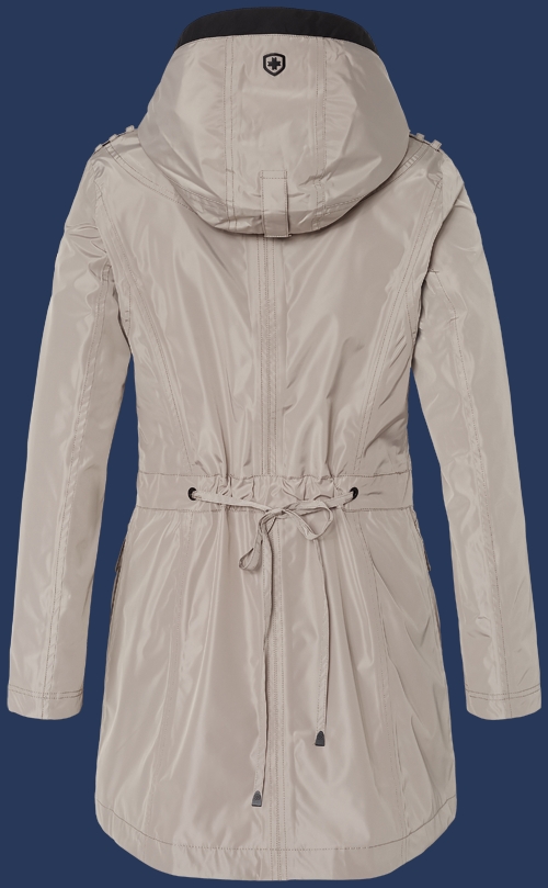 Практичный, слегка расклешенный плащ с прекрасными дизайнерскими деталями. Тонкие окантованные карманы на молниях на груди, большие гофрированные карманы с приподнятыми краями и удобными боковыми карманами для рук. Забавная дизайнерская деталь на кармане и задней области плеча: Два люверса, через которые проходят контрастные по цвету ленты. Из такой же ленты сделана длинная молния спереди. В задней части, две узкие полоски ткани можно завязывать петлей, чтобы регулировать талию. Капюшон съемный регулируемый в двух направлениях. Также интересная деталь: эполеты с тремя петлями. Рекомендуется машинная стирка при температуре 30 °. Не рекомендуется применять смягчители ткани и химическую чистку.