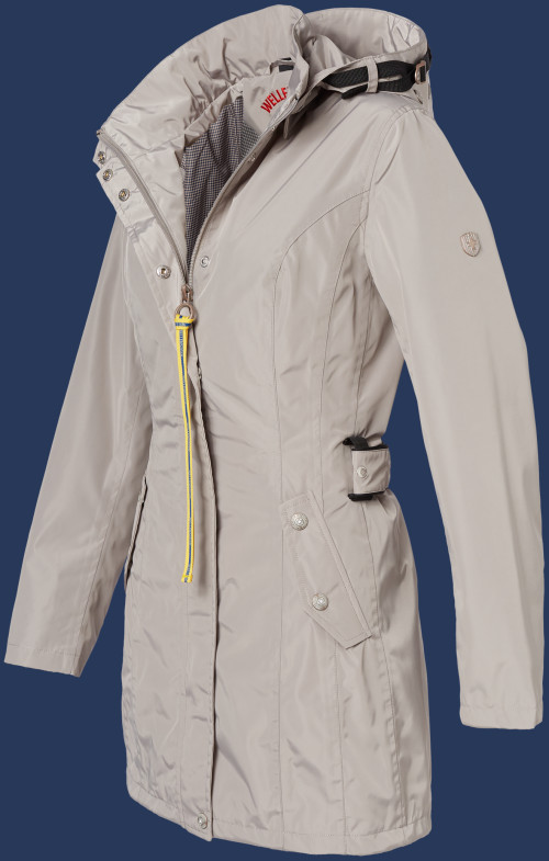 Простой, облегающий плащ. Красивый, приятный силуэт с рельефными швами и вытачкой спереди, однако, со сдержанным дизайном. Два удобных боковых кармана являются водонепроницаемыми. Ярким элементом является длинная молния контрастного цвета с лентой, которая может быть также снята. Сзади на талии можно использовать регулируемый ремень, который акцентирован черным кантом. Капюшон съемный, регулируемый кулиской. Благодаря ламинированной ткани внутри куртка водонепроницаемая и ветрозащитная, швы проклеены. Рекомендуется машинная стирка при температуре 30 °. Не рекомендуется применять смягчители ткани и химическую чистку.