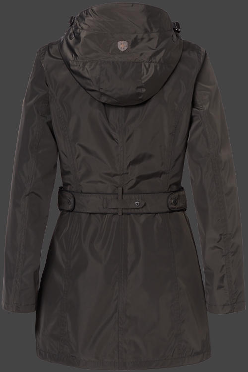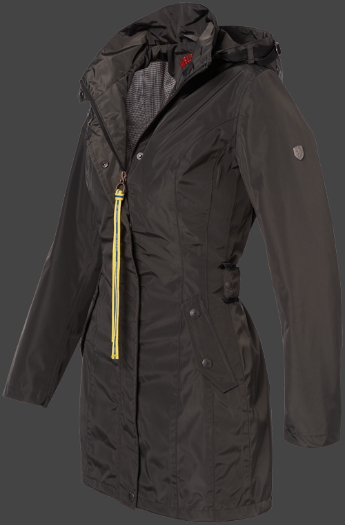 Простой, облегающий плащ. Красивый, приятный силуэт с рельефными швами и вытачкой спереди, однако, со сдержанным дизайном. Два удобных боковых кармана являются водонепроницаемыми. Ярким элементом является длинная молния контрастного цвета с лентой, которая может быть также снята. Сзади на талии можно использовать регулируемый ремень, который акцентирован черным кантом. Капюшон съемный, регулируемый кулиской. Благодаря ламинированной ткани внутри куртка водонепроницаемая и ветрозащитная, швы проклеены. Рекомендуется машинная стирка при температуре 30 °. Не рекомендуется применять смягчители ткани и химическую чистку.