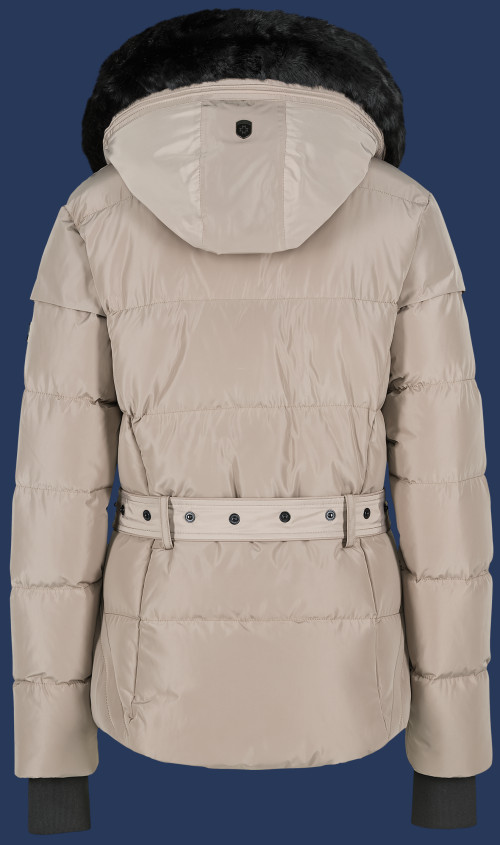 Скроенная сзади несколько длиннее, с немного полукруглым срезом куртка Tivoli это стиль в "Два в одном". У нее приталенный крой. Длина сзади около 70 см в размере М. Она является стеганым пуховиком с утеплителем. У куртки есть воротник-стойка, четыре наружных и два внутренних кармана и широкий регулируемый ремень. Внутренняя часть капюшона, отделана объемным искусственным мехом, который крепится на кнопках. Передняя двухсторонняя молния дает необходимую свободу передвижения. Рекомендуется машинная стирка при температуре 30 °. Не рекомендуется применять смягчители ткани и химическую чистку.