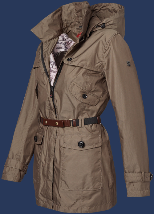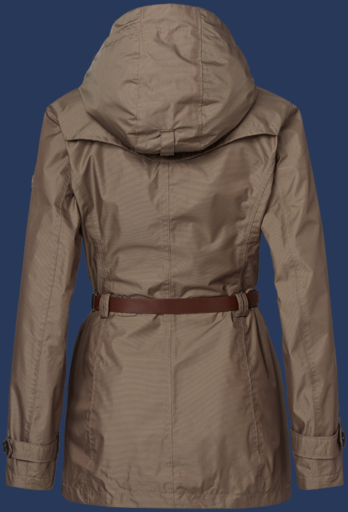 Классическое полупальто в стиле сафари. Плечевые кокетки в передней и задней части крепятся элегантными пуговицами, ремень выполнен из черной резинки и коричневой кожи с высококачественной, матово-золотой пряжкой. Выше пояса есть плоские карманы с закругленными клапанами, боковые накладные клапанные карманы с удобными разрезами для рук. Капюшон съемный, регулируемый в двух направлениях. Пальто ламинированное, водонепроницаемое и ветрозащитное, с проклеенными швами. Его легко чистить и можно стирать в машине при 30°С. Не рекомендуется применять химическую чистку и смягчители ткани.